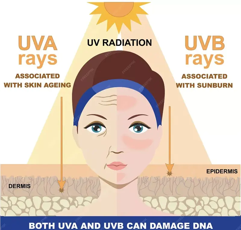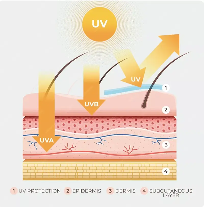 UVA మరియు UVB రెండూ చర్మానికి హాని కలిగిస్తాయి, అయితే వాటి చొచ్చుకుపోయే లోతు కారణంగా వాటి ప్రభావాలు భిన్నంగా ఉంటాయి. స్పష్టంగా ధనిక UVA చర్మంలోకి లోతుగా చొచ్చుకుపోతుంది మరియు ఫోటోయేజింగ్తో నేరుగా సంబంధం కలిగి ఉంటుంది, ఎందుకంటే అవి ROSను ఉత్పత్తి చేస్తాయి మరియు కొల్లాజెన్ మరియు ఎలాస్టిన్ను క్షీణింపజేస్తాయి, ఇది ముడతలు, చర్మం స్థితిస్థాపకత నష్టం మరియు అకాల వృద్ధాప్య సంకేతాలకు దారి తీస్తుంది. దీనికి విరుద్ధంగా, UVB ప్రధానంగా ఎపిడెర్మిస్ను ప్రభావితం చేస్తుంది, దీని వలన సన్బర్న్ (సోలార్ ఎరిథీమా) మరియు స్వల్పకాలిక మెలనిన్ ఉత్పత్తికి కారణమవుతుంది, అయితే దీర్ఘకాలిక ఎక్స్పోజర్ హైపర్కెరాటోసిస్కు దారితీస్తుంది మరియు చర్మ ప్రాణాంతక కణితుల ప్రమాదాన్ని గణనీయంగా పెంచుతుంది.