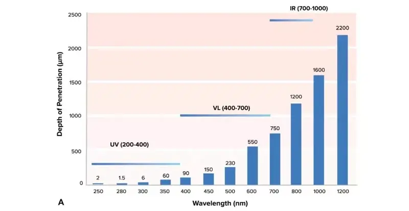 పై చిత్రంలో చూపినట్లుగా, కనిపించే కాంతి చర్మంపై గొప్ప ప్రభావాన్ని చూపుతుంది, ఎందుకంటే ఈ బ్యాండ్ చర్మంలోకి లోతుగా చొచ్చుకుపోయే లోతును కలిగి ఉంటుంది. ఎరుపు కాంతి ఎపిడెర్మిస్ మరియు డెర్మిస్లోకి చొచ్చుకుపోయి కొవ్వు పొరను చేరుకోగలదు, తరంగదైర్ఘ్యం మరియు చొచ్చుకుపోయే లోతు మరియు తరంగదైర్ఘ్యం మరియు శక్తి మధ్య విలోమ సంబంధాన్ని సూచిస్తుంది, అయితే నీలి కాంతి ఎరుపు కాంతి కంటే ఎక్కువ శక్తిని మరియు తక్కువ చొచ్చుకుపోయే లోతును కలిగి ఉంటుంది.